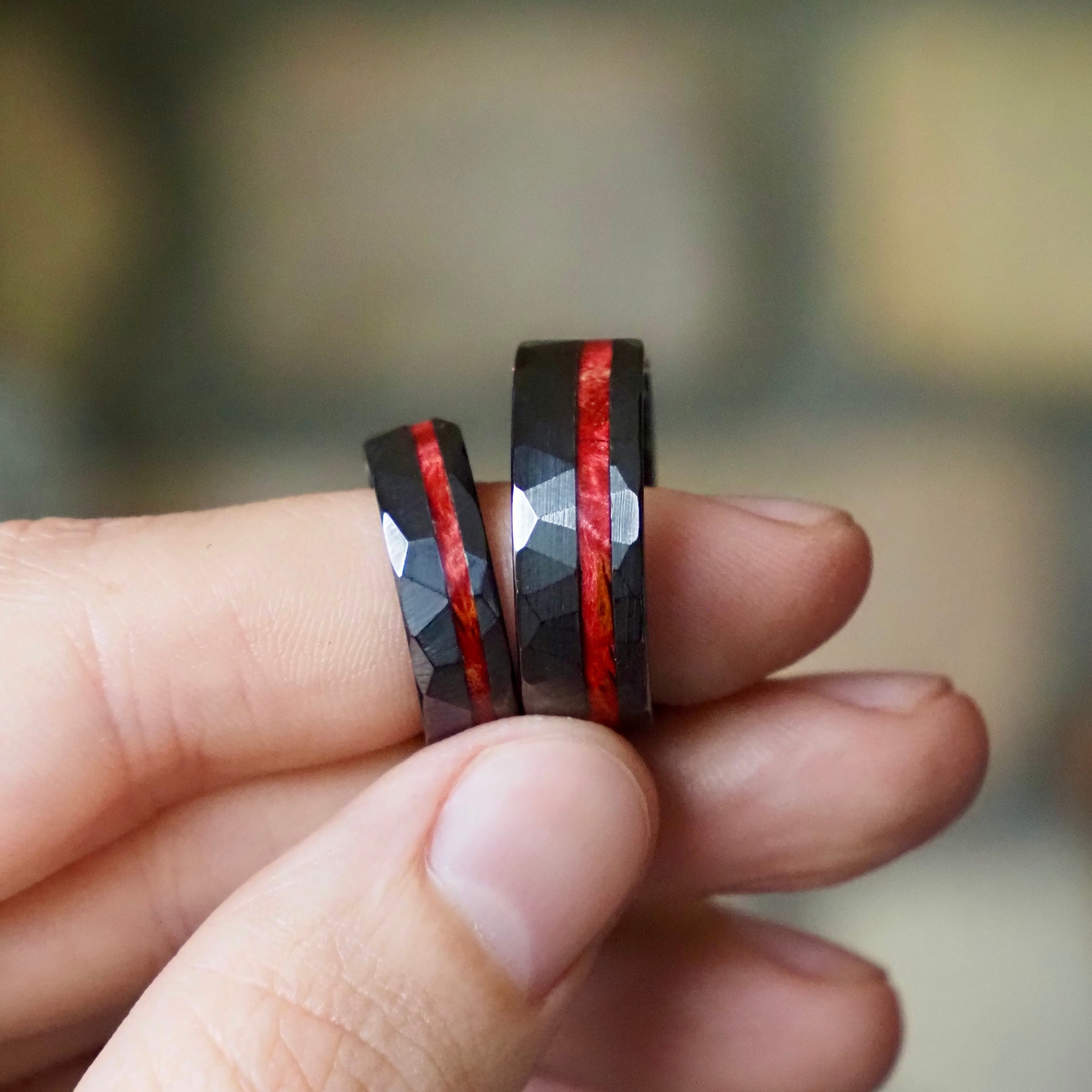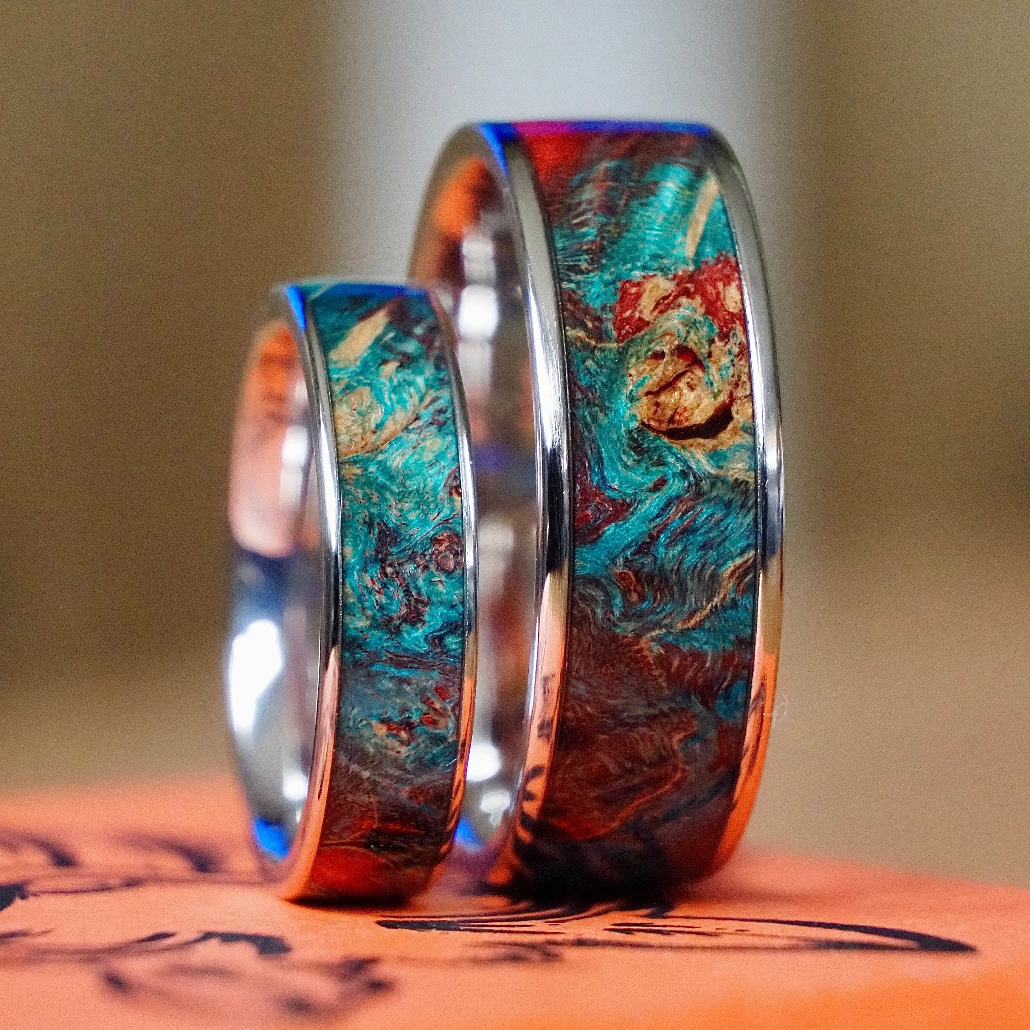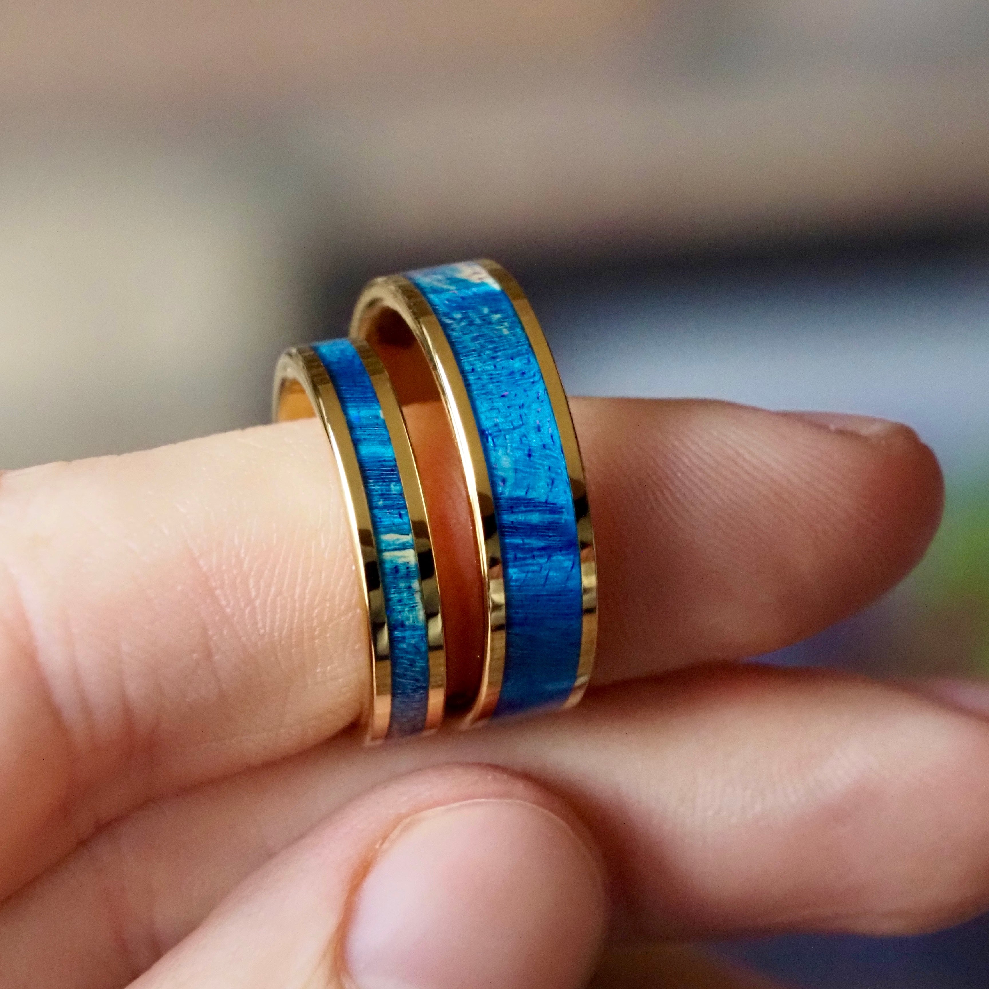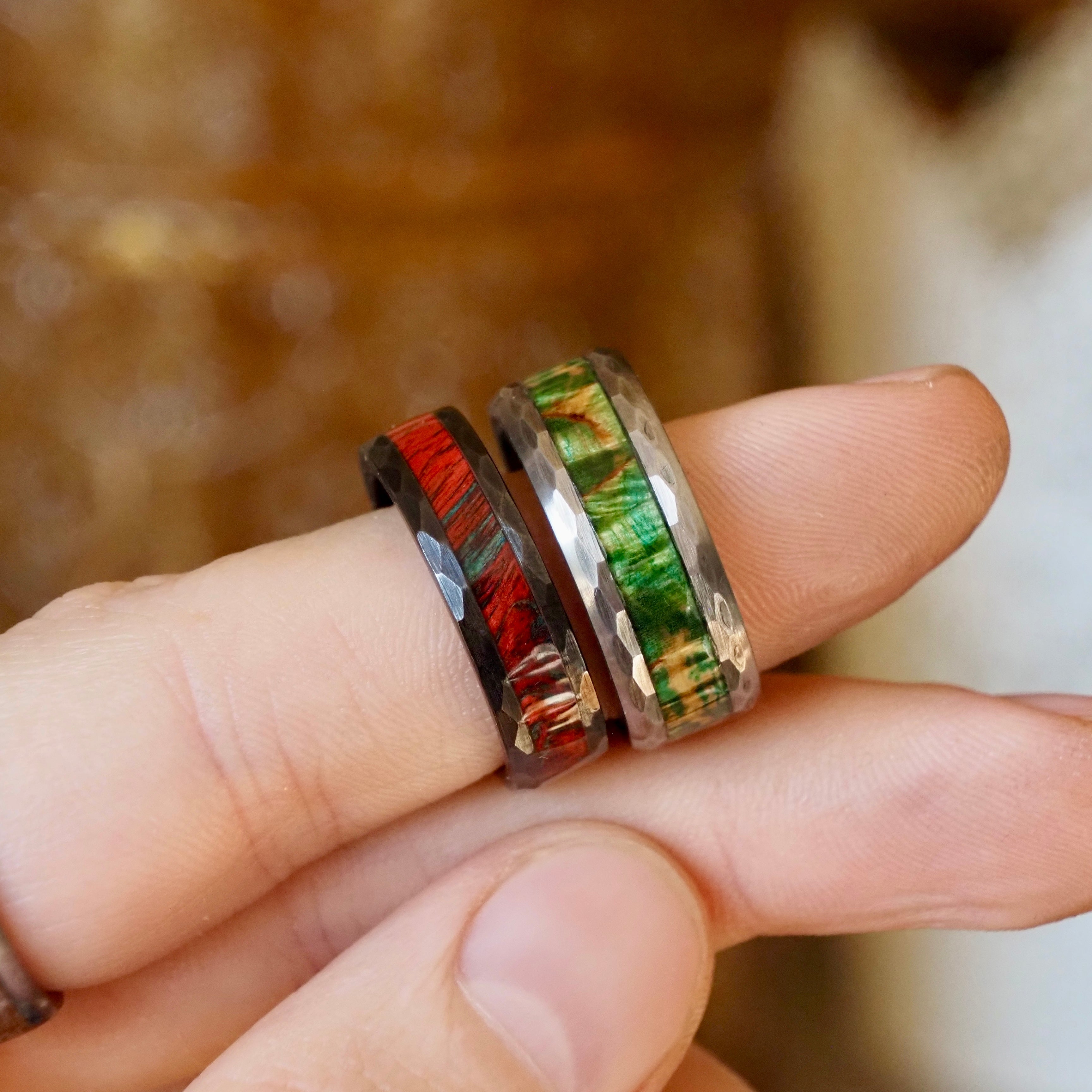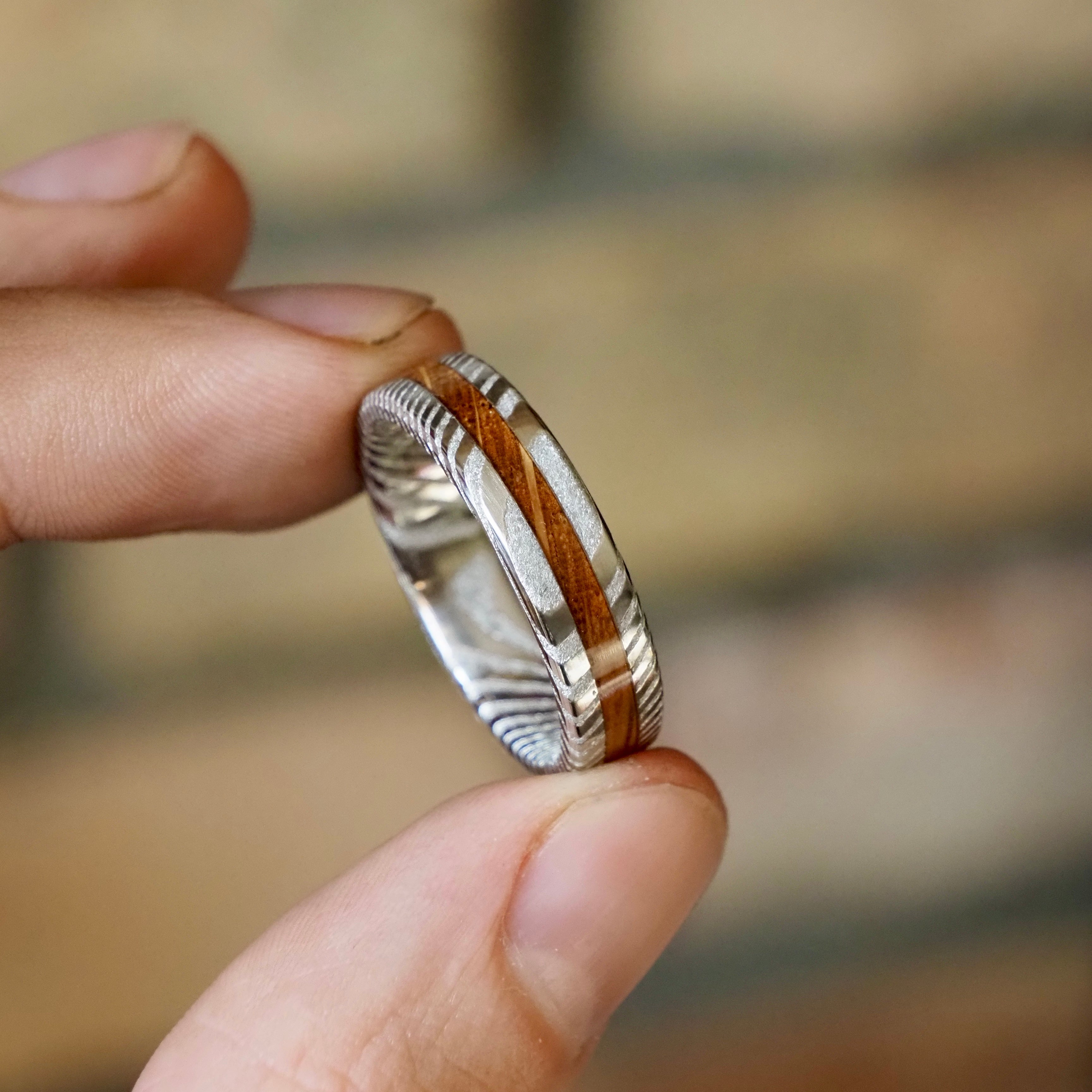Damascus Steel is famous for its mesmerizing patterns and exceptional strength which is why it makes a very special material for a wood inlay ring. Damascus steel is made by a unique forging process that involves layering and folding different types of steel. It's not scratch-resistant but it is very strong and made of lightweight stainless steel, so it's comfortable and you don't have to worry about wearing it every day.