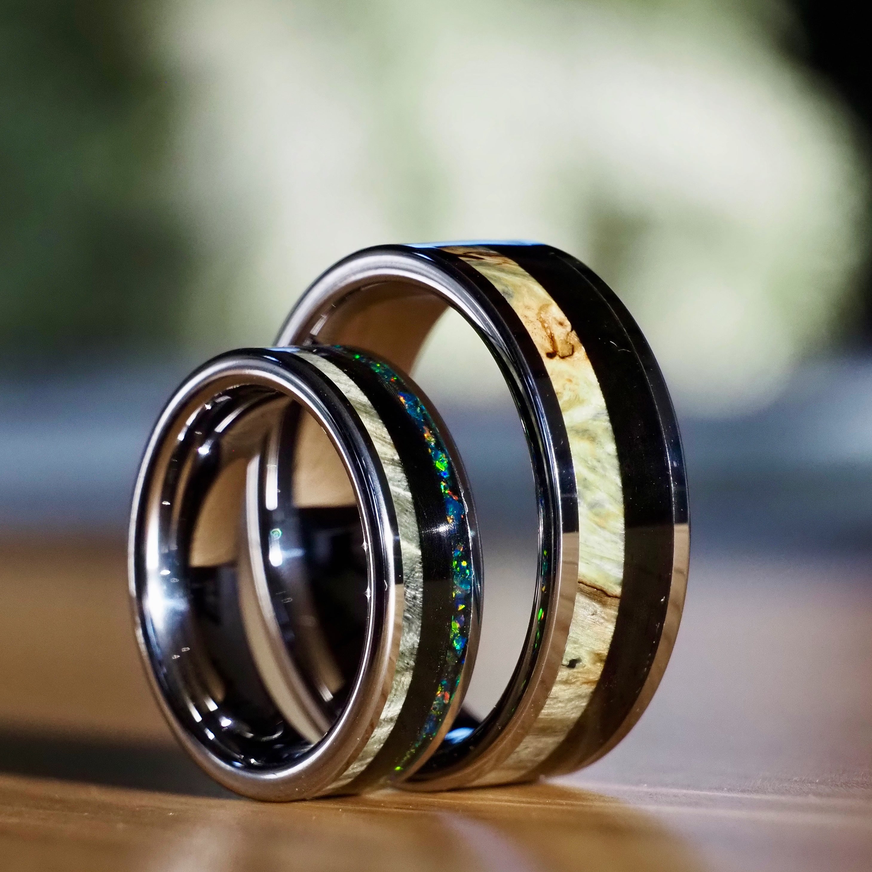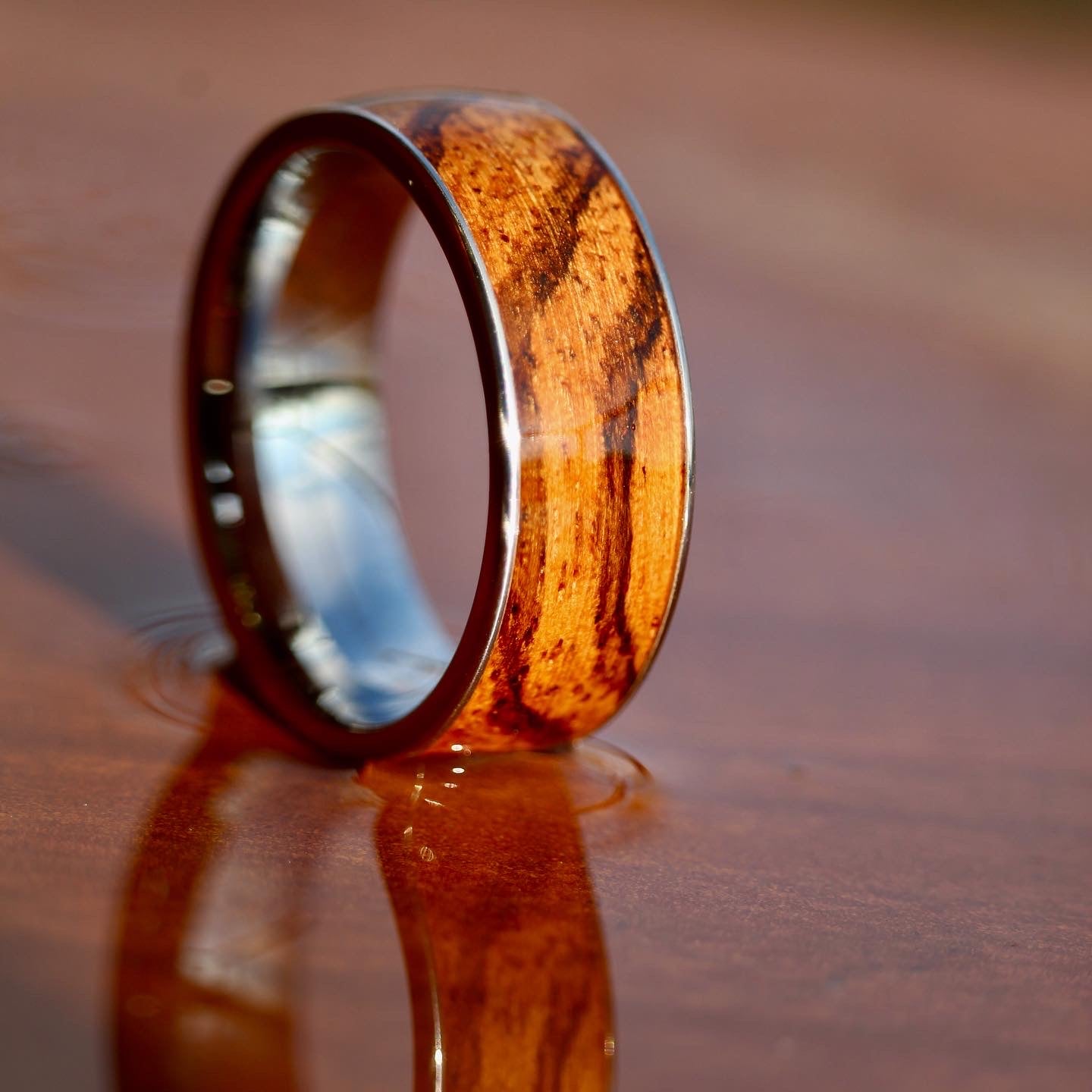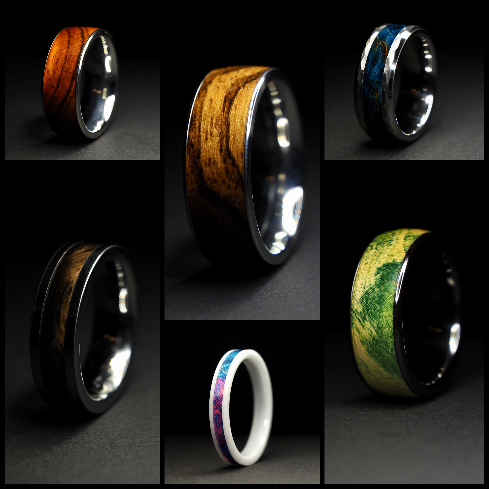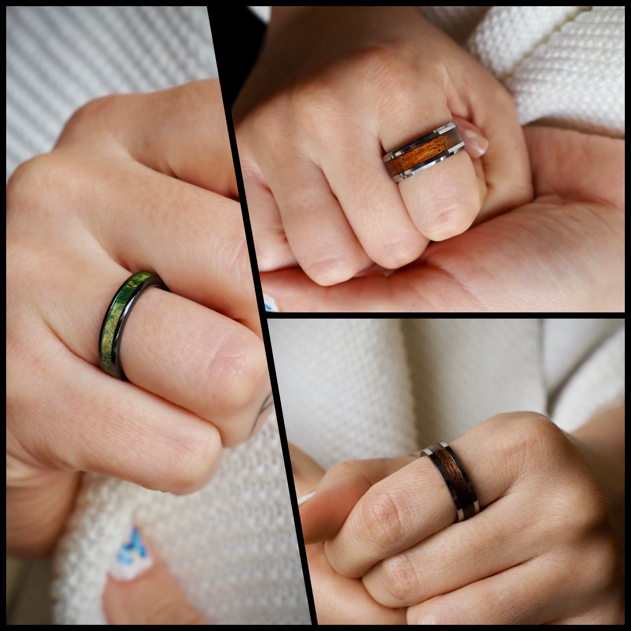 NOTERA: Träets skönhet blir mer framträdande i bredare ringar. Om du vill ha ytterligare inlägg, välj minst 5 mm bredd.